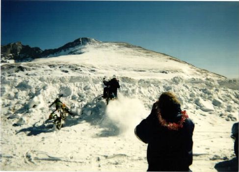 More general craziness took place with various attempts to climb the snow banks. While all this was going on, Lazslo Nemeth arrived on his R-100. Undoubtably the largest bike to make the top without the aid of traction devices.