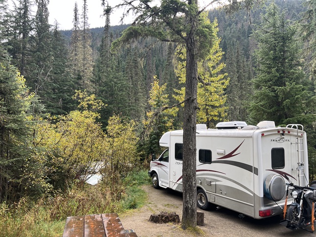 7) Illecillewaet Campground, Glacier National Park, Revelstoke, BC, September 21, 2025 - Happy with our first day in Canada, we next took the drive north along the Kootenay River Valley up to the northern Selkirk Mountains where we set up camp in Canada's Glacier National Park (which is about 40 miles west of where we'd turned south on our 2018 motorcycle ride across Canada). We found a perfect camping spot in the Illecillewaet Campground right on the Illecillewaet River and just a short walk away from the main trailheads in this valley..