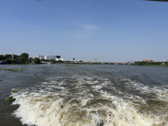 184) Sông Sài Gòn Waterbus, Sài Gòn, Vietnam, March 1, 2025 - The first day of our new tour was primarily about logistics so not a lot to share. We got up early and had breakfast at the hotel. Then we packed up our luggage and checked out of our room. We stored our bags in the hotel luggage room to be picked up in the afternoon. Then we were off to do one sightseeing activity before our tour schedule dominated the rest of the day. The weather is Saigon is always warm and even at 9am that was true. We knew the temperature would be going up as the sun got higher in the sky so doing our outing in the morning would spare us the worst of the heat. It was a thirty minute walk, at a brisk pace, to go the 1 1/2 miles from our hotel to the Saigon River. There are fancy sightseeing boat trips you can do on the river but a traveler’s tip we read in a travel book is the Saigon Waterbus. The government introduced this about 10 years ago to try to ease traffic. It is a commuter ferry that travels along the Saigon River with a dozen stops along the way. A one-way ticket costs 15,000 Dong ($.60) and the trip takes about an hour with boats leaving the main pier every 90 minutes. As a bonus there is a Starbucks at the pier so we could get some decent tea while we waited for the 9:30am boat. The ride was mellow with some nice views of the city skyline and it was interesting to see the other river traffic as freighters and barges sailed past.
