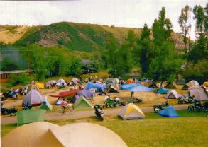 Finding the Rally site was easy. The flood of bikes must have looked like someone has stepped on an ant colony. The large parking lot was wall-to-wall bikes and every inch of shaded ground had a tent on it. After signing in and checking the bulletin board for pointers to fellow netters, we headed out to look for a campsite. A helpful staffer mentioned that there might be room to camp behind the ballfield so we wound our way through the sea of bikes and tents to find plenty of room albeit without any shade.