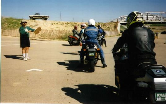 When "C" pulled back in, my friend Joel Frahm helped me bump the front preload up a notch. There wasn't anything I could do about the jetting or tranny, so I went back out with the "A" group for their "no brakes" drill. Wow, things were moving much faster now. I followed David "Nashville Flash" Braun around with Victor "Dances with Hawks" Johnson behind. These guys move! Watching Flash on his Beemer R-80 was like watching high speed ballet. He's very smooth. During this session, the front end felt much better. That extra preload really helped.