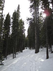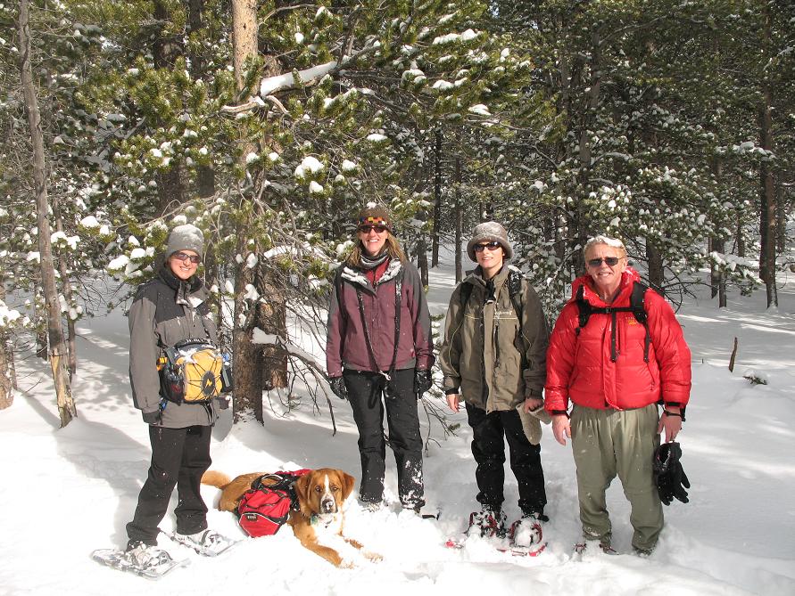 7) Forest Lakes, CO - February 8, 2009 - Our regular hiking crew was able to add another guest to our weekend hikes as our friend Krista wanted to try out her new snowshoes. In an attempt to find snow we headed up to the Moffat Tunnel trailhead but with the intention of hiking the Forest Lakes trail this time rather than our usual Heart Lake trail. Unfortunately, Jonna and Krista only hiked the first miles in and the warm, sunny weather had made the snow too wet and hardpacked to use the snow shoes. After Jonna and Krista turned back Alan, Lyle, Holly and Buster continued on for another mile and a half before running out of trail just short of the lakes. All in all, a fun hike totalling around 5 miles and with some good elevation as well.