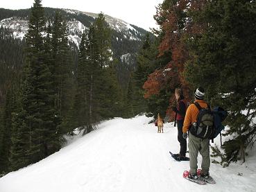 5) Sourdough Trail, CO - January 25, 2009 - Our friend Desiree again joined our usual hiking team for a snow shoe hike on the Sourdough trail. It was typical Colorado weather: We met under blue skies, started hiking with light snow, went through near blizzard conditions and then ended back under blue skies with bright sunshine. Through it all, the powder was perfect and the weather relatively warm. We hiked in about 2 1/2 miles, then headed back for a total of around 5 miles.