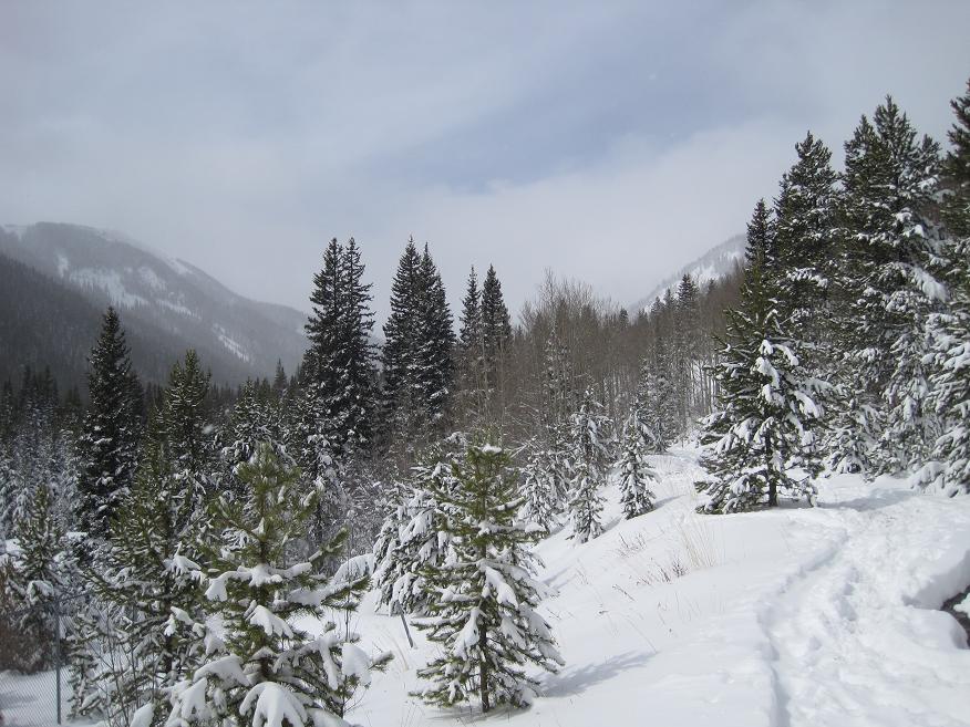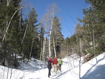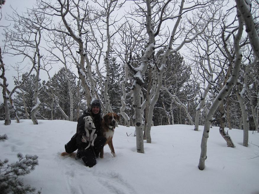 41) Unnamed trail near Como Creek, CO - December 19, 2010 - Lyle was out with a hurt foot (after the Skate Ski lesson) so Alan, Jonna, Holly and the pupsters headed out for our last hike of the year. Wanting to finish the year with our "hiking new trails" theme, we headed up to the Sourdough south trailhead but then headed south from there on an unnamed trail that went down into the Como Creek valley. Deep snow (with more falling) meant we broke out the snowshoes for our first snowshoe of the winter. We had the trail to ourselves and enjoyed hiking through some beautiful aspen groves. Just under 3 miles with about 350 ft of elevation drop (and then regained on the hike back out).