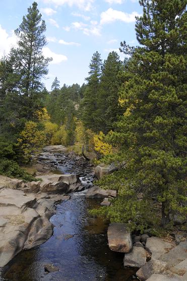 30) Ceran St. Vrain, CO - October 3, 2010 - Our friends Una and Mauricio joined us this week, so we went back to our favorite "visitors hike"...Ceran St Vrain. This time though. we got to both catch the last of the aspen leaves and to explore the trail loop out at the end of our usual hike. One surprise on today's hike was finding massive fire mitigation work had been done along this trail resulting in hundreds of downed pine trees. 6.2 miles total with about 600 ft of elevation gain.