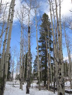 37) Shelter #1 trail, Golden Gate Canyon State Park, CO - November 21, 2010 - A morning snow storm gave way to beautiful blue skies for another new hike, this time an unexplored corner of Golden Gate Canyon State Park. Lyle was out of town for the holiday, so it was Alan, Jonna, Holly and the pupsters. No grand scenic vistas on this hike but lots of thick pine forest, fresh snow and a huge grove of aspens to literally top it all off. 3.5 miles with 1,000 ft of elevation gain.