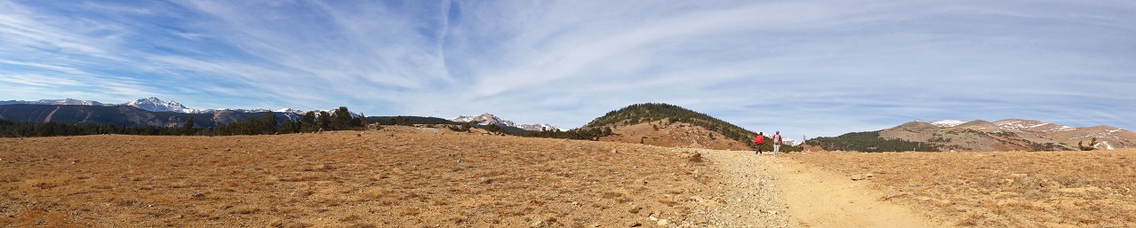 42) West Magnolia trail system, Nederland, CO, November 13, 2016 - Despite Alan gimping due to a back injury we still managed to get out for a short hike. In an effort to avoid rocky, back-jarring decents we headed to the nearby West Magnolia trial system and walked a relatively flat loop there. A line of clouds covered most of the big mountains along the Continental Divide but we still got a few glimpses of the snow-covered peaks. 2 miles with a mild 200 feet of elevation gain.