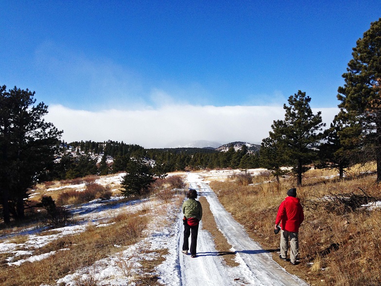 4) Los Lagos Reservoir Loop Trail, Rollinsville, CO, January 24, 2016 - Alan was on-call again so our hiking group had to make it short and sweet this weekend. Fortunately, we also made it interesting by parking vehicles in two different locations and hiking between them. Last year we found the connector trail that links the Los Lagos Reservoir trail system with the West Magnolia trail system so we started at the Los Lagos Reservoir trailhead, hiked through to FS 105 and then from there hiked to one of the West Magnolia trailheads. There was a snow storm on the way with a spectacular wall of clouds on the western horizon but we had a gorgeous blue sky overhead for the morning hike. 3.4 miles with 300 feet of elevation gain.