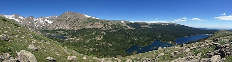 26) Arapaho Glacier trail, Rainbow Lakes Trailhead, Ward, CO, July 11, 2016 - Jonna and Alan had last minute packing to do before leaving on vacation but that didn't keep us from getting out with hiking buddy Lyle for a quick hike. With the summer weather hot and breezy we decided to take advantage of the bright sunshine to hike up above tree line. We pushed through the masses of campers at Rainbow Lakes to get to the Arapaho Glacier trailhead and then did the climb up to the overlook of the Triple Lakes (part of the chain of lakes in the Boulder water reserve). The tundra above the trees was covered in yellow wild flowers and the lakes reflected the clear blue color of the sky. The trip up and back was 5.6 miles in length with 1,200 feet of elevation gain.