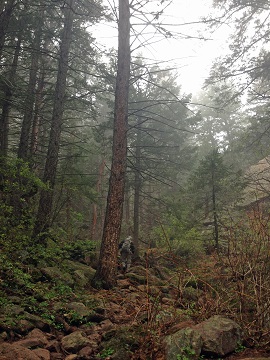 17) South Boulder Peak, Mesa trailhead, Eldorado Springs, CO, May 15, 2016 - It was just Lyle and Alan for this weekend's hike. We managed to find a window in between rain storms in which to try to check off the last of our annual Spring hikes - South Boulder Peak. With clouds hanging halfway down the mountains and fog floating across the trail we made the trek up Homestead trail to the bottom of Shadow Canyon and started climbing. Halfway up, Alan ran out of energy and we had to turn back before seeing what was sure to be a fantastic panoramic view of the inside of a cloud from the peak. Still, spring flowers were already popping out all along the trail and the streams were burbling away with rain run-off so it was a nice hike nonetheless. 6.3 miles with 1,600 feet of elevation.
