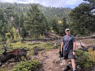 33) Kenny Mountain, Pinewood Springs, CO, September 27, 2018 - For a couple of years Todd has been planning a hike up into the Big Elk Meadows burn area to see how the area has recovered since the forest fire happened back in July, 2002. This weekend we decided it was time to go exploring. Todd, Lyle and Alan found a parking area off County Road 47 and, since there wasn't a trail, we just started going uphill. Between my GPS and Todd's phone map we wound our way up towards Kenny Mountain. It was a steady, steep climb but because most of the burned trees have fallen in the 15+ years since the fire the hillsides are open, grassy meadows so the views were excellent. We eventually worked our way to the top and headed for the peak. After a bit of rock climbing we got to the top...only to realize that we'd picked the wrong peak. The actual top of Kenny Mountain was about 1/4 mile to the north. Nonetheless, the panoramic views we stunning. We chose a different, and as it turns out steeper, route back down to the car. It was a tough hike but the vistas from up top were worth it. 4.8 miles with 2,100 feet of elevation gain.