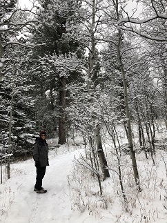 21) Mud Lake, Boulder County Parks & Open Space, Nederland, CO, October 27, 2019 - With a multi-day snow storm just rolling in, the temperature starting to plummet and a light, fluffy snow coating everything we decided to get out to stretch our legs for a bit before things got too messy to venture out of the house. We layered up, strapped on the micro-spikes and walked the trails at nearby Mud Lake. We hiked both the Tungsten Loop and the attached Kinnickinnick Loop so almost all the trails in the little park. It was chilly but good gear and keeping moving kept our body temperature warm. The landscape was beautiful: The snow was so light it looked like fur covering the individual pine needles and bare aspen branches. Fields of dry grass looked like dandelions with poofy white crowns delicated balanced on top of each blade of grass. Mud Lake itself was frozen over and mostly coated with a blanket of fresh white snow. It was well worth getting out in the weather to take in such beauty! 2.2 miles with a mild 250 feet of elevation change.
