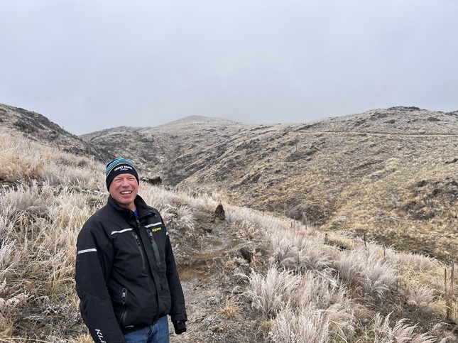 94) Bobbcat Ridge Natural Area, City of Fort Collins Natural Areas Dept, Masonville, CO, December 13, 2023 - Todd and Alan got together for a nice mid-week and end-of-the-year hike. The weather was iffy with grey clouds hanging low in the sky but the forecast said no snow should fall so we headed north to give it a try. We chose the Bobcat Ridge Natural Area just outside Masonville, CO. When we got to the parking lot the top of the ridge was covered by the clouds which meant they were just a few hundred feet above us. We started up the Ginny Trail which meant we were immediately going up. The meadows along the front of the mountains were wet and the trail was muddy but as we gained altitude the moisture turned into frost and ice. Soon all the grass was coated with a layer of white hoar frost - an ice crystal layer formed by moisture in the air combined with a freezing wind. As we continued to climb we went up into the cloud layer at which point ice crystals started forming on us. My beard, eyebrows and any hair sticking out from under my hat were turned into ice. At the top As we continued to climb we went up into the cloud layer at which point ice crystals started forming on us. My beard, eyebrows and any hair sticking out from under my hat were turned into ice. At the top of Ginny Trail we reached the high point and turned north onto the Power Line Trail. We started to drop back down but the hill we'd been climbing was shielding us from a slight breeze and once we rounded it the temperature seemed to drop a few degrees. Additionally, the trail here was covered in a thin layer of ice making footing tricky. As the trail came down the ridge the trail conditions improved and we dropped down out of the cloud. Near the bottom of the ridge we turned onto the Valley Loop Trail which was buddy but clear of ice and frost. That took us back to the bottom of Ginny Trail where we returned to the trailhead. A good hike and uniquely beautiful with everything up high covered in hoar frost. A 9.7 mile loop with 1,600 feet of elevation gain.