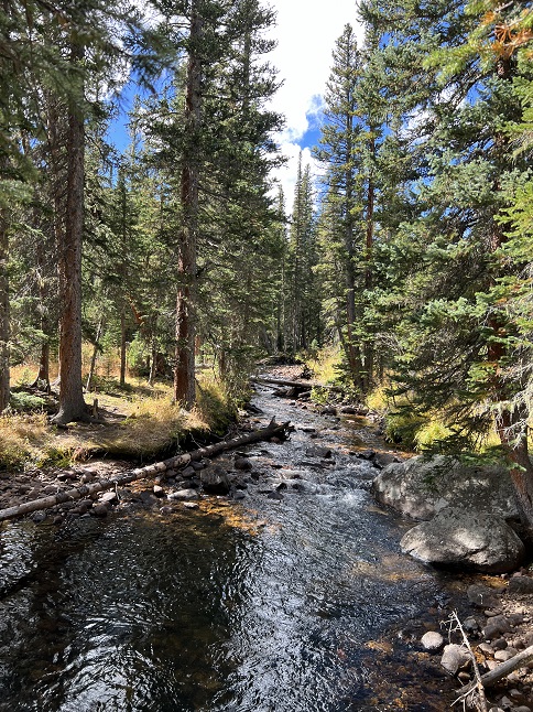 71) North Fork Big Thompson River Trail, Comanche Peak Wilderness, Dunraven Trailhead, Glen Haven, CO, August 15, 2023 - Whew! It was back-to-back long hikes for Alan, thanks to Todd and Alan meeting up to hike the North Fork Big Thompson River Trail. The original plan was to do an easy hike since Rusty the wonder pup was feeling tired but at the last minute Todd decided Rusty should have a rest day so we switched our plans to do a longer hike instead. The North Fork Trail runs beside the northern branch of the Big Thompson River for awhile and then begins to climb up northern side of the valley offering views down on the river. The middle section of the trail goes through a burn area which is filled with burnt tree trunks and thus no shade. With temperatures in the upper 80s it was toasty out in the direct sun and for some reason this open area was filled with biting horseflies. No stopping to catch our breath on the uphill climb! We turned back where the trail entered Rocky Mountain National Park but the trail continues for another 9 miles to eventually hit Lost Lake in RMNP. It was nice to revisit an area neither of us had been into for at least a decade. A 9.1 mile out and back hike with 1,400 feet of elevation gain.