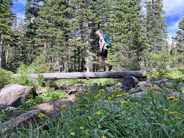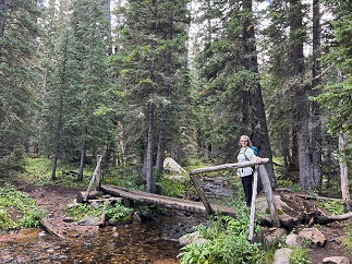 62) Diamond Lake, Indian Peaks Wilderness, 4th of July trailhead, Eldora, CO, July 24, 2023 - We generally avoid hiking in the high country after noon since summer thunderstorms can roll in quickly. However, today the weather looked promising and a mid-week afternoon seemed like a good opportunity to find parking at the extremely popular 4th of July trailhead so we made an exception. We drove up around 2pm and found a parking spot mere feet from the trail. There were some big thunderheads to the north but the sky to the west was clear so we took the risk. It has been many years since we last did the hike to Diamond Lake so it was fun to re-visit it. Since this is in a Wilderness area the trail is just barely developed - a few bridges over the larger creeks and streams - but otherwise it is just a narrow track through the forest. In the places were winter avalanches have knocked down the trees there are hillsides covered with lush wildflowers and the same along the banks of the streams cascading down the steep mountainsides. It was a terrific hike! When we got up to Diamond Lake it was clear that dark clouds were coming over the Continental Divide fast so we made an abrupt turn-around and immediately retraced our route. We stayed ahead of the clouds for the return trip and got back to the car without any drama. A really splendid afternoon in the mountains! A 5.2 mile up and back hike with 1,200 feet of elevation gain.