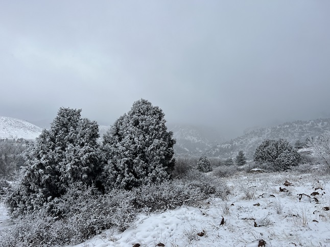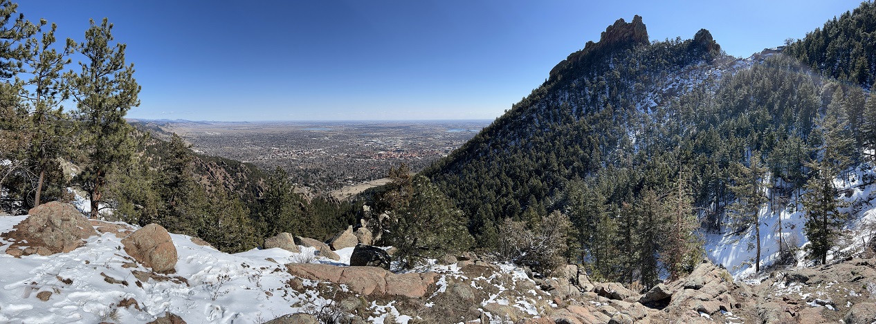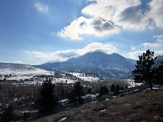 23) Homestead, Shadow Canyon Spur and Mesa Trails, South Mesa Trailhead, Boulder Open Space & Mountain Parks, Boulder, CO, March 27, 2023 - An overnight storm dropped a couple of inches of fresh snow along the Front Range but that didn't dissuade us from joining Desiree for a mid-day hike at the South Mesa Trailhead. Fortunately, the sun was trying to break through the low-lying clouds which pushed the temperature up enough to start melting some of the snow and kept it from being too cold to enjoy. The Flat Irons looked gorgeous with a layer of snow on them and the pine trees were equally pretty dusted with white. We opted to hike the medium version of the loops we do from this trailhead - hiking up the Homestead Trail, switching to the Shadow Canyon Spur trail and taking that over to Mesa Trail, which we then took back to the trailhead. Another nice afternoon hike. A 4.5 mile loop with 1,000 feet of elevation gain.
