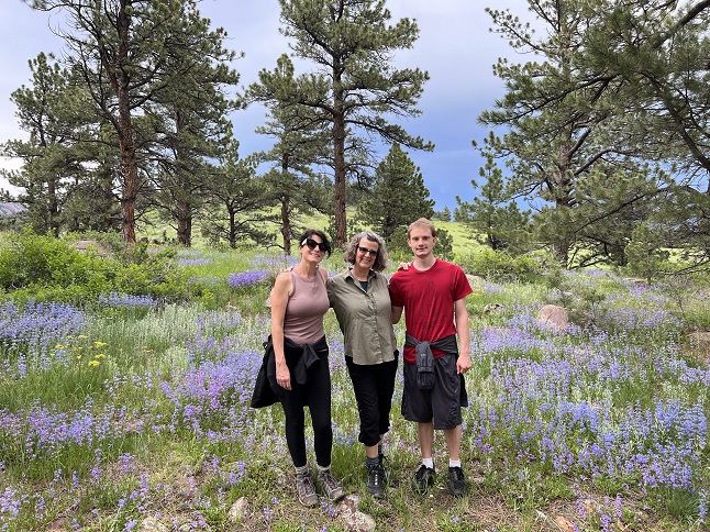 73) Anchor Mine, Caribou townsite, Nederland, CO, July 12, 2023 - Cousin Chi is starting CU-Boulder next week so she and her Mom, Alan's cousin Michelle, and her brother Sam came out a week early to get her moved into her dorm and to spend some time in Colorado. Jonna and Alan brought the family out for a hike up to the Anchor Mine (since Michelle's maiden name is "Anchors".) Most of the wildflowers had wilted away but there were still a few Indian Paintbrush and some Hare Bells that were hanging in there. This is probably the easiest hike in the area to get up to treeline so we also got to show them a little of the alpine tundra. Michelle was inspired to do some impromptu yoga beside a stream that winds among the mining buildings but then a passing rain cloud encouraged us all to head back down. We braved the cold shower and, as the clouds broke up, we were partially dry when we got back to the trailhead. A nice excursion into the mountains and a fun photo-op with the "Anchors" family standing next to the Anchor Mine sign. A 3.3 mile out and back hike with 450 feet of elevation gain.