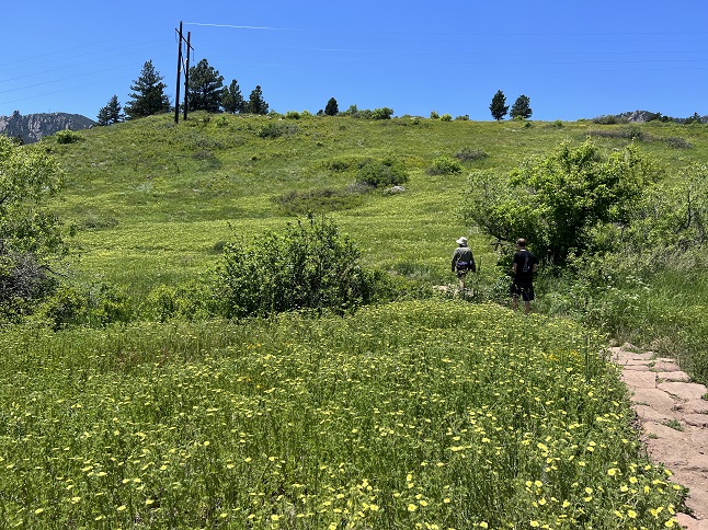 47) Homestead, Shadow Canyon and Mesa Trails, South Mesa Trailhead, Boulder Open Space & Mountain Parks, Boulder, CO, June 9, 2023 - We are back from our trip and immediately back to our weekly hikes with Desiree and Gaelin. We managed to dodge and afternoon rain squall by meeting up late in the afternoon at the South Mesa Trailhead just after a dark storm cloud rolled through. There has been rain most days over the past two weeks and all that moisture has turbocharged the plant grown along the Front Range. The trail seemed almost tropical in places with hip high grass, a colorful tapestry of wildflowers, bushes heavy with berry buds and pine trees loaded with pine cones. Everything was verdant and lush. We did our "long loop" going up Homestead to Mesa, then taking Shadow Canyon trail around the west side before returning via the Mesa and Towhee trails. The variety and sheer quantity of wildflowers was amazing. We were all in positive spirits before the hike and the beautiful landscape just boosted it. A fine way to finish off the week! A 5.8 mile loop with 1,200 feet of elevation gain.