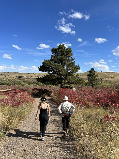 75) Homestead, Shadow Canyon Spur and Mesa Trails, South Mesa Trailhead, Boulder Open Space & Mountain Parks, Boulder, CO, September 24, 2023 - We got together with our friend Desiree for another Sunday evening hike but this one had the added importance of being a pre-birthday outing for Desiree so we made it a shorter hike so we had time for a nice celebratory dinner afterwards. However, we still did the "middle" loop of the three we've made standard hikes from the South Mesa Trailhead. The birthday surprise was finding fields of late summer wildflowers still blooming in the shady areas around the trail - tiny little white and yellow daisies and bright purple flax. This was contrasted with the yellow and red leaves starting to dominate the ground cover and the tall stalks of brown grass with light tan seeds waving in the intermittent breeze. The sun is starting to set earlier and earlier so the sun dipped behind the Front Range peaks while we hiked which provided some nice lighting as beams of light speared between the mountains. A pleasant loop and a fun way to help Desiree celebrate another year! A 4.5 mile loop with 1,000 feet of elevation gain.