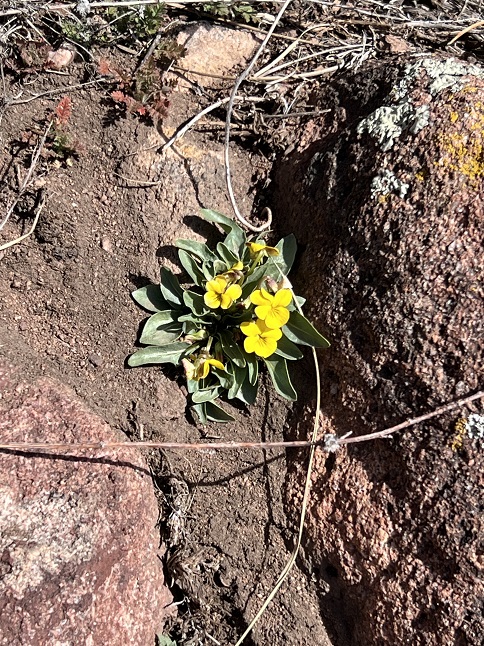 25) Homestead, Shadow Canyon and Mesa Trails, South Mesa Trailhead, Boulder Open Space & Mountain Parks, Boulder, CO, April 2, 2023 - The first tiny little wild flowers of the spring have poked their pedals out of the ground! There were only a couple and they were very small but nothing says winter is starting to fade quite like seeing the first wildflower of the year. We met up with Desiree for our usual Sunday hike - The Homestead/Shadow Canyon/Mesa Trail loop from South Mesa Trailhead but this time we started in the morning rather than the evening. Wow, is that trailhead a different experience at 10am! In the evenings it is quiet but in the morning it is mayhem - cars jockeying for parking spots, dogs running rampant, people standing around talking oblivious to the vehicles trying to navigate the parking lot, etc. Fortunately, most of the people are headed straight down Mesa trail so we left the craziness behind once we turned onto Homestead Trail. The trails are now mostly dry so not only has the snow and ice melted but the resulting mud is drying up as well. The weather was warm (70s?!?!) and the sky was so blue it looked unnatural! Like someone turned up the color saturation on the world. Most of the grass and shrubs are still grey-brown but those few little flowers proved that Spring is here! The usual 5.8 mile loop with 1,200 feet of elevation gain.