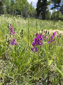 46) Coyote Hill Loop #314 Trail, Pagosa Ranger District, Pagosa Springs, Colorado, June 6, 2023 - What is probably the last hike of our Four Corners trip was a nice one. We spent the morning doing a 3 hour guided tour a Chimney Rock National Monument but during all the time we spent on that (very good) tour we actually only walked about a mile. So after having a picnic lunch near the Chimney Rock visitor center we drove to a trail system that is northwest of Pagosa Springs to do one of the hikes there. We chose the Coyote Hill Loop trail and it was a great pick. This trail is at a higher elevation than we've been previously on this trip and the alpine wildflowers were in full bloom. There were purple, pink, yellow and white flowers carpeting the hillsides and the marshy low points were filled with big patches of purple irises. The San Juan mountains and Pagosa Peak were prominent features on the horizon. We had sunshine and warm temperatures but dark clouds were forming as we hiked and rain was forecast for the evening so we were lucky to have such perfect hiking weather. A fine way to finish off our two weeks of hiking while on the road! 3.5 mile loop with 450 feet of elevation gain.