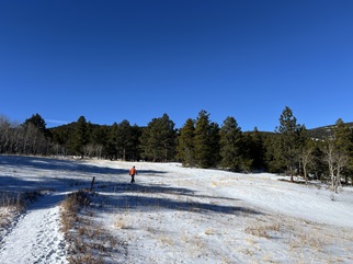 96) Caribou Ranch Open Space, Boulder County Open Space Parks, Nederland, CO, December 30, 2023 - In an effort to break the holiday sloth, Jonna and Alan headed over to nearby Caribou Ranch Open Space to stretch our legs. The trail was mostly packed down snow - right on the verge of requiring microspikes but we managed to do the whole hike without putting ours on. It was a cloudless blue sky overhead which contrasted nicely with the white ground and the bare bone-white aspen tree trunks. A 4.2 mile loop with 250 feet of elevation gain.