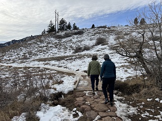 8) Chautauqua, Bluebell-Baird, Mesa and Enchanted Mesa Trails, Chautauqua trailhead, City of Boulder Open Space and Mountain Parks, Boulder, CO, January 27, 2023 - Snow and cold weather are on the way so Jonna and Alan met up with Julia down in Boulder to do a little loop in Chautauqua Park while the weather was favorable. We met up at the Chautauqua office on Friday afternoon, strapped on our boot traction cleats and climbed up the hill on the Chautauqua trail towards the first FlatIron. From there we turned south on the Bluebell-Baird trail along the base of the FlatIrons to where it met up with Mesa trail. We dropped down the hill and then looped back to Chautauqua village via the Enchanted Mesa Trail. It was overcast and a little breezy so a little chilly but the conversation was warm so we made it back to the parking lot without feeling too uncomfortable. A 2.8 mile loop with 650 feet of elevation gain.
