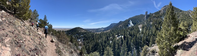 28) Hurricane Hill trail, Nederland, CO & Homestead, Shadow Canyon cutoff and Mesa Trails, South Mesa Trailhead, Boulder Open Space & Mountain Parks, Boulder, CO, April 16, 2023 - How about two hikes in one day! In the morning we did a hike from the house with Julia where we did most of the loop around Hurricane Hill. The trail was covered in snow from a storm two days ago so we were slipping and sliding on snow covered ice for most of the trail. In the afternoon we drove down to Boulder for our weekly hike with Desiree. This time we did the "medium" loop since everyone was feeling a little low energy. The Homestead/Mesa/Shadow Canyon cut-off trails were all completely dry and the early evening sun kept the temperature warm Two different hikes on two different trails and with two different hiking partners. A great way to spend a day. Combined we hiked 8 miles with a combined 1,000 feet of elevation gain.