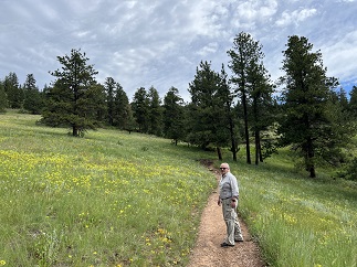 60) Windy Peak trail, Golden Gate Canyon State Park, Golden, CO, July 20, 2023 - Despite predictions for rain most of the day, Alan and Lyle met up at Golden Gate Canyon State Park to get in a morning hike. Fortunately, we timed it perfectly. Starting late enough that the skies had cleared from a big overnight thunderstorm and finishing just as rain drops started falling as afternoon rain clouds started rolling in. We decided to try out some trails we hadn't hiked in about a dozen years - the Burro & Mountain Lion trails that go up Windy Peak in the eastern part of the state park. There were fields of wildflowers all along the trail, particularly near the beginning of Burro trail, but the highlight was visiting the old Tallman Homestead - an old ranch from the 1880s with a small mill pond and some outbuildings. It was a steady climb from the trailhead up the western shoulder of Windy Peak and much of the trail was lined with colorful blossoms and beautiful aspen trees. A nice hike and a good chance to catch back up with Lyle after not hiking with him for a few months. A 5 mile up and back hike with 900 feet of elevation gain.