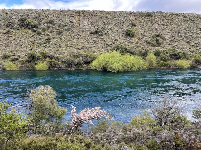 89) Cerro Villegas, Dina Huapi, Argentina, November 5, 2023 - Today we finally got to hike in Patagonia and it was a great experience. The original plan was to hike Bella Vista, a big Andean mountain right on the Argentina-Chile border but the late season snow storms and low lying rain clouds this morning forced us to change. I am a little disappointed we didn’t get the Top-of-the-World experience on top of a snow-covered Andean peak but we definitely made the right call. We got picked up in the morning by our guide Javier and he was doubtful about the conditions on Cerro Bella Vista or the alternate neighboring Cerro Goye. So instead of heading west to the big peaks we instead drove to the eastern edge of Nahuel Huapi Lake where it empties out into Rio Limay. This river is a deep turquoise color which was very beautiful. From the trailhead on this end of the lake we could see that the western end was completely socked in with rain and all the peaks were covered with clouds. Hiking there would be cold, wet and have no visibility. Where we were was overcast and a little breezy but clear of rain. We started our hike along the river and the views were lovely. In a few places cherry trees (non-native) were covered in delicate blossoms which were dropping into the surreally blue river. After about half a mile we turned and started to climb out of the river valley. There must not be a spanish word for "switchback" because the trail builders clearly didn't know about them. If they wanted to go up a mountain they built a trail straight up! We huffed and puffed about a 1,000 feet to the top of a ridge and then turned east to start up Cerro Villegas. It is a rocky peak but the mountain's sides are the same sandy terrain as the pampa - the grasslands that stretch all the way from the Andes to the Atlantic Ocean. Big clumps of grass, spring wildflowers and some low shrubs - nothing taller than knee high. As we climbed we spotted some cool animals: First was a herd of wild Guanacos (similar to a llama), then some Red Hawks hunting for rodents that live in the grass. Higher up we spotted a pair of Andean Eagles playing in the thermals. A lovely aerial dance. However, the highlight came when we reached the summit. First off was the weather. As we climbed the clouds broke up and when we reached the top we had a window of perfect blue sky above us. Across the lake it was still nasty but we had perfect skies. Second was the view. While the mountains to the west were covered by clouds we had gorgeous snow covered peaks to the north. To the east was a seemingly endless roll of hills which eventually flatten out to the pampa. To the south were mid-sized mountains but directly below us was a line of little ponds where we could still see the herd of Guanacos grazing. Finally, the highlight - an Andean Condor - a fully grown adult with a 9 foot wingspan came floating past us. Maybe 50 feet off the peak and below us so we were looking down onto his or her back. Just riding the wind. After about a 1/4 mile it caught a thermal and shot a few thousand feet up in altitude and then glided off to the west high out over the lake. It was AWESOME! While we were up on the summit three more condors came by but none of them were so close. I was buzzing from the experience as we started down. We took a different route to descend which went by a "cave" that was on the southwest side of the mountain. The cave was an area where softer rock had collapsed leaving an concave overhang in the face of a cliff. We climbed up and rested for a bit in the shade enjoying the view through the window. Then we climbed back down to the riverside and retraced our tracks to the car. It was a very scenic hike with a strenuous enough climb to feel like we earned it and some amazing animal sightings. An excellent start to our Patagonia hiking! A 7.5 mile loop with 2,400 feet of elevation gain.