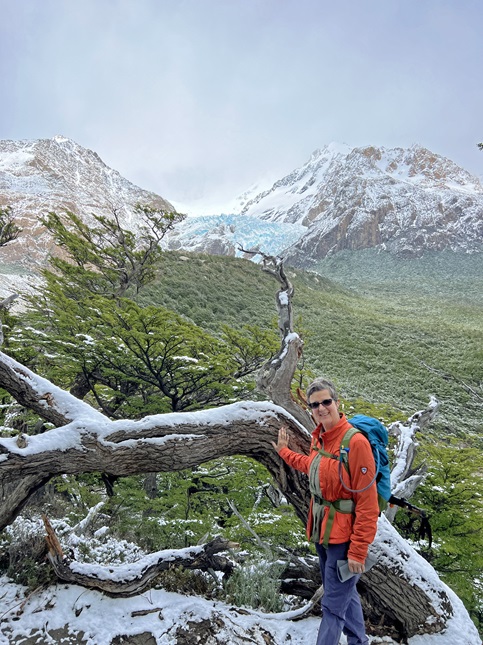 91) Mirador Base Las Torres, Parque Nacional Torres del Paine, Cerro Castillo, Chile, November 11, 2023 - Jonna and I have been training all year to prepare for two big hikes on this trip and the first of those hikes was today. I’m not gonna lie - this was a strenuous hike - but wow was all the training worth it! The day started early with us getting up at 6am to grab a quick breakfast at the hotel and get our gear together for our 6:30am pick-up. Our driver for today was Rodrigo, the same driver we'd had the day before on a bus tour, and our hiking guide was a young guy named Vicente. There were just five of us doing the hike - a Chilean gentleman named Hernando who was celebrating his birthday and a woman named Evelyn who is an Argentinian travel agent from Buenos Aires. It had rained most of the night but that had petered out by sunrise leaving everything wet and the air temperature pretty chilly. All that rain was snow up on the mountains with the snow-line only about 400 feet above the elevation of the town. However, the clouds were hanging just a couple of hundred feet above that so we couldn't see the tops of the mountains. The drive into Torres del Paine takes about two hours so we relaxed and tried to rest to make up for waking up so early. Just as we passed into the park it started to rain again - it wasn't looking great for our hike. By then time we drove out to the Torres del Paine welcome center the rain stopped so back to looking okay to start our hike. Our driver Rodrigo would be waiting for us which seemed crazy since we would probably be hiking for eight hours but I think he has to be available in case any of us had a problem and had to turn back early. We each stuffed the contents of our provided box lunches into our packs and hit the trail. The first mile of the trail runs along the front of the mountains and is roughly level. As we hiked the clouds inched a little higher which gave us a tantalizing glimpse of the bottom of the mountains which were towering over us. The next section of the trail was a mile with a steep climb up the side of a ridge - no switchbacks just a steep, rocky trail kind of like uneven stairs. The heartening thing was that we seemed to be pushing the clouds up as we climbed; for every hundred feet of elevation we gained the clouds seemed to rise an equal amount. At the top of the ridge we turned into the Rio Ascencio valley. The trail is up high on the rim of the valley which provided a beautiful view up the valley with the rushing, cascading Rio Ascencio down in the bottom. The other outstanding part of this view is that some small creeks were tumbling down the sides of this valley out of the low lying clouds in long waterfalls. Magical! The next mile was actually going downhill into the bottom for the valley where the Refugio Chileno - a warming hut - is located. We stopped for 15 minutes to use the restroom and to eat some of our box lunch. Despite the cold temperatures we had built up a lot of body heat from the climb up to the top of the ridge but going downhill and then standing around on the deck dropped our core body temps so we started hiking again. At this point we reached the snow line but also switched from the pampas grassland into the Chilean rainforest so suddenly there were trees and bushes. There was also a lot of water coming down so the trail started to regularly cross bridges over creeks and streams. We were also getting drips of melted snow, globs of wet snow and even mini-flurries when tree branches would shake loose fresh snow. It was wild to be getting snowed on under the canopy of a rainforest! Again, magical. The trail was again climbing upwards but with a rolling landscape as we went up a hill and then dropped back down on the other side to cross another water drainage - all while gaining elevation as we continued up the river valley. After another couple of miles we reached the final climb - where we turned away from the river and made a mile long super steep climb up into a hidden bowl. At this point the clouds had quit rising and it started to snow - we'd easily experienced all four seasons thusfar on this hike. The clouds and snow were also demoralizing because hiking up into a cloud when the landscape was so spectacular wasn't the destination we were hoping for. Nonetheless. We enjoyed the stunning wintery landscape we could see and just kept climbing up. Step by step we ascended out of the rainforest and into the rocky scree field on the very shoulder of the tallest mountains in the heart of the park. It was slow going because the trail was slick with snow and wet granite rocks. We gained about 1,200 feet in this last mile! I don't put any stock in mystical "luck" but we sure seem to have more than our fair share on our hikes on this trip. Just as we reached the top where a small lake sits at the very base of the namesake of this park - the Torres del Paine (The Blue Towers) - the clouds parted like misty curtains to let the glorious sunshine beam down on all three of the towers. Literally, 15 minutes before the distinctive spears of rock were shrouded and a cheer erupted from the hikers at the lake when the white mist cleared. As new people arrived they immediately said "Wow!" at the sight. We found a place where we could stare in awe at the scene while eating the last of our lunch. Now, this is probably the time to admit that we did not enjoy this trail in solitude. This is a very popular trail and there were probably a hundred other hikers at the lake when we arrived. I joked that the park service needs to install stadium seating and assign seats. It was kind of crazy. And during the hike our little group of five could immediately become a group of twenty or more on the steepest uphill sections when one slow hiker would back up traffic until a wide enough part of the path could be reached so faster hikers could pass. Still, even with the crowds the scenery at the lake was incredible. We stuck around for abou