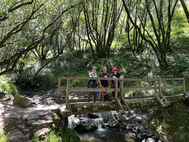 20) Wildcat Gorge and Lake Anza, Tilden Regional Park, East Bay Parks, Berkeley, CA, April 30, 2024 - After being in the Bay area for nearly a week we finally had a day when all of us could get together for a hike. Jamie and Kelly (and pup Daisy!) drove Jonna and I up to Tilden Regional Park to do an easy hike there. We were going to hike near Jewel Lake but it turns out dogs aren’t allowed in that trail so we found a different trail we could hike from the same parking lot. The Wildcat Gorge trail is relatively flat so an easy walk but is quite beautiful as it is built alongside Wildcat Creek which winds through oak, bay, redwoods and eucalyptus trees. We took the trail up to Lake Anza and then made the loop around the lake on the Lake Anza Trail. Along the way we saw turtles and lizards and trout and heron and a hummingbird. There were also quite a few different varieties of wild flowers in bloom which meant bees and dragonflies and butterflies. All in all a nice day out and then we capped it off with an equally nice lunch in nearby Lafayette so two thumbs up for this outing! A 3.7 mile out-and-back with a mellow 350 feet of elevation gain.