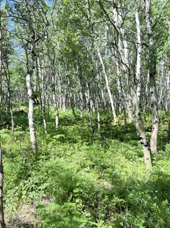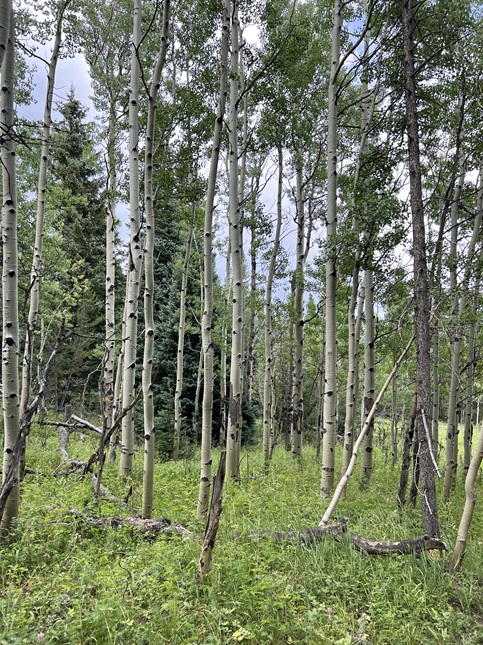 40) Gould Loop Trail, State Forest State Park, Gould, CO, August 6, 2024 - After our terrific alpine hike the previous day we decided to do something different for our second day of camping at State Forest State Park. The south fork of the Michigan River flows through the campground area and the Gould Loop Trail runs alongside it all the way to the State Park Visitor Center. This provided the possibility of spotting a moose so we decided to give it a try. Unfortunately, the exceedingly hot weather meant it was well into the 80s when we started the hike mid-morning and that probably doomed our moose spotting as they were probably bedded down in the shade to avoid the heat. That wasn't a bad idea for people too but we soldiered on despite most of the trail running through areas that had been cleared of trees subjecting us to direct sun for much of the hike to the Visitor Center. We spent some time using the Visitor Center wifi and then started back. For the return we crossed over the river and hiked back along the river along the southern side. The trail there was slightly higher up above the river valley and more of it was in forest so we got some shade from the afternoon sun. We spotted a hawk up in a dead tree and about a thousand grasshoppers but I think all the sensible critters opted to lay low and try to stay cool. A 6.3 mile loop with a mellow 200 feet of elevation gain.