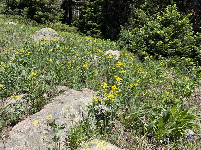 34) Ellsworth Creek trail system, Rollinsville, CO, July 4, 2024 - We enjoyed the wildflowers at Ellsworth Creek so much yesterday we did it again today. Our friends Desiree and Gaelin came up from Boulder for an afternoon hike and we were once again lucky to have the trail to ourselves. In addition to hiking the loop we did yesterday we also made the climb up to the old Ellis Lode Mine and took a look at the meadow just above it. We had a beautiful blue sky filled with white puffy clouds that contrasted nicely with the green field of colorful wildflowers. I'll always prefer the brightly colored bunches of blossums exploding in a field of green over fireworks to celebrate the 4th of July! A 3.9 mile out-and-back with 900 feet of elevation gain.