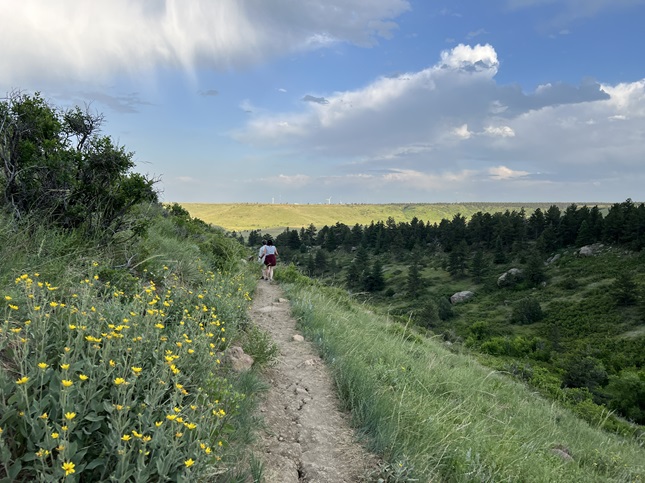27) Homestead, Mesa and Towhee Trails, South Mesa Trailhead, Boulder Open Space & Mountain Parks, Boulder, CO, June 10, 2024 - As soon as we returned from our month long European vacation we turned our attention to our neglected tradition of hiking down in Boulder with our friend Desiree. We resumed the Sunday evening hiking by meeting up at the usual trailhead, the South Mesa Trailhead, and then hiking our usual trails - Starting on the Mesa trail, then turning west on the Homestead Trail to where it rejoins the Mesa trail. From there we started up the Mesa Trail towards Shadow Canyon but turned back early and returned on Mesa Trail to where the Twohee Trail cut-off branches off. We took that back to where it rejoins the Mesa Trail and then returned to the trailhead. It was a lovely evening with just enough clouds in the sky to keep the temperature down to an enjoyable level. The summer wildflowers were blooming all along the sides of the trail and we saw both turkeys and deer dining on the lush green hillsides along Towhee Trail. It also gave us plenty of time to swap travel stories with Desiree and catch-up on each other's lives so an enjoyable evening all around. A 4 mile loop with 750 feet of elevation gain.