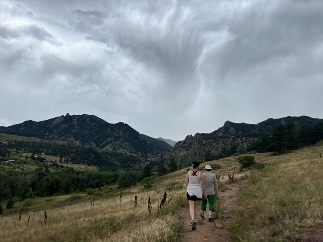 32) Homestead, Mesa and Towhee Trails, South Mesa Trailhead, Boulder Open Space & Mountain Parks, Boulder, CO, June 30, 2024 - Despite all three of us feeling very low energy Desiree, Jonna and Alan all dredged up enough motivation to get together for our usual Sunday evening hike. We once again got together at 6:30pm which allowed us to avoid the heat of the day but meant we would start the hike with dark storm clouds hovering over our heads and with the rumbling of thunder echoing off the Front Range mountains. The recent baking hot weather has cooked most of the wildflowers into shriveled brown husks but a few varieties of flowers were thriving with all the sunshine - Crested Prickly Poppies, Yarrow, Coneflowers and Meadow Arnica. The clouds gave us a few sprinkles just as Homestead trail connected with Mesa Trail so we decided to turn back there. Thankfully, despite the ugly looking gray sky, the heavy rain held off. Those clouds did make for some dramatic views looking back on the mountains as we hiked out on Towee Trail and weirdly contrasted with spots of blue sky that was visible off to the south. We ended the hike with a close-up view of a pair of young deer out enjoying the tall summer grass. A 3.2 mile loop with 600 feet of elevation gain.