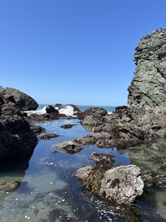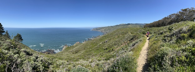 21) Owl Trail, Muir Beach Overlook trailhead, Golden Gate National Recreation Area, May 1, 2024 - For our last day in California (for this trip) we decided to squeeze in another final hike. Jamie and pup Daisy brought Jonna and I up to the Marin Headlands to hike along the spectacular Northern California coast. We chose to head to Muir Beach where we parked at the Marin Beach Overlook trailhead and hiked the short but stunning Owl Trail all the way down to Slide Ranch. Then, on our way back up, we took some side trails down to the tidepools on the edge of the Pacific. The trails were little used (we only saw one other person) and a bit over-grown. The side effect of this was that the tall grass was filled with ticks. We were stopping regularly to knock the creepy crawlies off and spent the two hours after the hike still finding them. On the plus side were the lovely wildflowers, the glorious sunshine and the amazing views of the rocky coastline. After hiking all the trails in this area we drove down to Muir Beach and spent some acclimatizing Daisy with waves and salt water. It was so cute we were all laughing and saying "Awwwww..." We finished off with lunch on the edge of San Francisco Bay. A pretty fine way to close out this trip to visit Jamie and his family. A 2.8 mile out-and-back with 600 feet of elevation gain.