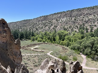 35) Pueblo Loop Trail, Bandelier National Monument, White Rock, NM, July 11, 2024 - We made a quick trip down to Santa Fe to visit the annual International Folk Art Market and had a free day so we drove up to Bandelier National Monument to see the canyon and its Ancestral Puebloan cliff dwellings. The only access to the canyon in the summer is via a shuttle bus from White Rock which means our hiking was limited to what we could access from the main visitor center. Since we only had a couple of hours we defaulted to the most popular one - the Pueblo Loop Trail that runs along the northern wall of the canyon and which has a mostly continuous string of dwelling sites and that ends at the Alcove House up on the cliff wall. It wasn’t a long or challenging hike - it was actually paved for half the distance - but it was cool to see all the caves, crumbling walls and other ancient living spaces. Well worth the side trip up from Santa Fe.