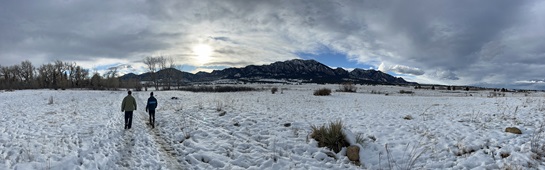 7) South Boulder Creek West Trail, Boulder Open Space & Mountain Parks, Boulder, CO, February 8, 2024 - Jonna and Alan drove down to Boulder where we met up our almost-family member Julia at her new place. She thought there was a way to hike directly from her front door into the Boulder Open Space & Mountain Parks area in South Boulder so we decided to go look for it. Fortunately, the fresh snow from a recent storm meant we could look for footprints and this allowed us to find a little path that eventually connected up with the South Boulder Creek West Trail. We hiked that west almost all the way to Mesa Trail but the setting sun (and rapidly dropping temperatures) turned us back before we connected into the Mesa trail system near South Mesa trailhead. We have plenty of time to catch up on Julia's new job and to enjoy the expansive views on the plains along the edge of the foothills. A 3.4 mile out-and-back with a mellow 200 feet of elevation gain.
