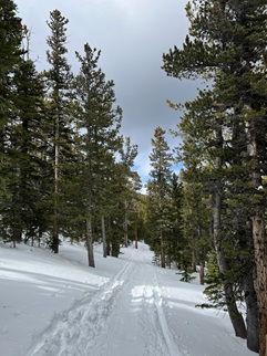 2) Sourdough Trail, Brainard Gateway Trailhead, Brainard Lake Recreation Area, Ward, CO, January 22, 2024 - Jonna and Alan decided to take advantage of last week's big snow storm to dust off our cross-country skies. We headed to Brainard Lake Recreation Area hoping that going up in elevation would mean better snow. Unfortunately, the trail was packed down into a groove. This wasn't a problem for a good skier like Jonna but was a big challenge for a bad skier like Alan. We ended up turning back early because Alan was finding the narrow groove problematic for controlling his speed. Nonetheless, even despite snow conditions, it was nice to be out in the silent and snow-covered trees. A 2.3 mile out-and-back with 200 feet of elevation gain.