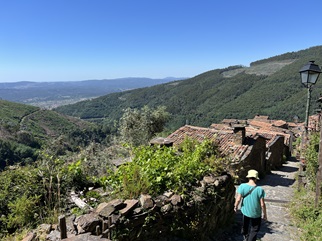 23) Rota do Marigo (PR8 LSA), Talasnal, Portugal, May 31, 2024 - We drove up into the central highlands of Portugal to visit one of the famous "Xisto" (Schist) villages. We chose the small village of Talasnal near the town of Lousã. We made the very twisty drive in the afternoon and then hung around until we could check into our mediocre lodging at 5pm. We then had a quick picnic dinner on the patio before heading out to do a short post-dinner walk on a marked trail that went down into the valley next to the village. The trail was steep down and steep back up but short enough to be doable before the sun set. We had low expectations for it since we were really just planning to stretch our legs after being in the car all day but it turned out to be amazing. The trail started by going down a ridge north of the city before pealing off the ridge and dropping down into the valley to the west. Then the trail turned south and climbed up the valley alongside the creek at the bottom. Once we were down in the valley it was like we'd stepped through a magic portal into a fairy tale. The sides of the valley were terraced with stone walls but they were everywhere and they seemed unimaginably old. The area had been abandoned in some ancient era and were now falling down, covered with thick green moss, cross-crossed by fallen tree trunks and threaded with flowering vines. The creek's channel had likewise been built up with stone and then bridged with stone arches, lichen covered wooden plaforms made from downed trees and big flat granite slabs. There were stone foundations of long missing buildings and overgrown side trails leading into thickets of brush. The trail was marked but the forest was so thick it was tricky to spot the periodic painted hashes made on rocks and tree trunks. The trail was also narrow, rocky and muddy. Sometimes it was just a narrow ledge along a rocky cliff face so it definitely wasn't for the inexperienced hiker. Because it was late spring and this area is so lush the entire area was also covered with wildflowers, which meant the air was buzzing with bees, flittering with butterflies and twittering with birds. At any moment we could have stumbled over a misty bridge and into Brigadoon and it wouldn't have been out of place. Stunningly beautiful and felt much longer than the 1.4 mile listed on the sign back in Talasnal. A 1.4 mile loop with 321 feet of elevation gain.
