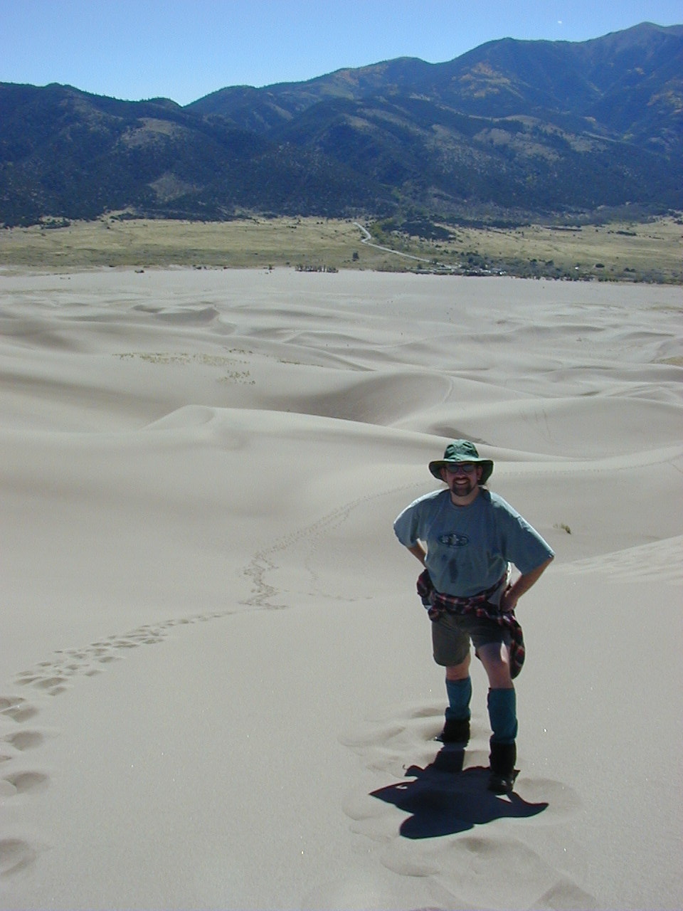 1) Alan starts up a sand dune in Great Sand Dunes National Monument. The visitor center is visible in the background but the picture doesn't convey the altitude gain very well!