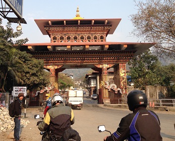 79) The next day marked a return to the bikes but also marked our entry into Bhutan. We rode through the entry gate and stopped at the office where we registered as visitors and picked up our mandatory Bhutanese guide.