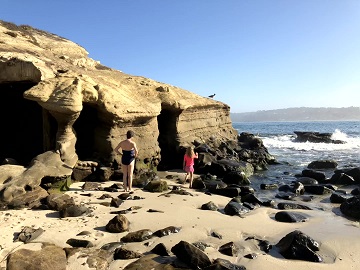 4) John, Makela and Ruthie generously picked us up again Sunday morning and this time we headed north. We grabbed brunch in La Jolla and then went to La Jolla Cove for some more beach time. We explored the sea cave, watched the seals that hang out on the rocks there, swam in the big breakers and played in the sand.