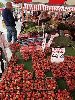 97) We had a day that we split with hiking in Manamansalo National Park and then driving through Finland's lake district to the town of Kuopio. When you look at this area on a map there are large areas where there is more water than land! We found a nice free parking lot right on Lake Kallavesi and had a beautiful lake view straight out the front windshield. As soon as we parked we unloaded the bicycles and went out exploring. The waterfront had a nice sidewalk/bike path along it with a bunch of boats offering lake cruises moored there. We also found an ice cream cart (Yay!) and a cloud burst of rain (Boo!). We did a loop through the main square as well but the whole city is a ghost town on a Sunday evening so we called it a day. The next morning the rain had stopped so we ventured out to see a little more of Kuopio. The town has an old market hall that now houses some specialty/gourmet food sellers. Too rich for our blood. ...but outside a farmers market had set up stalls so we bought fresh fruit and veggies there. Sadly, most of the museums in town are closed on Monday and the weather was too cruddy to do a boat trip on the lake.