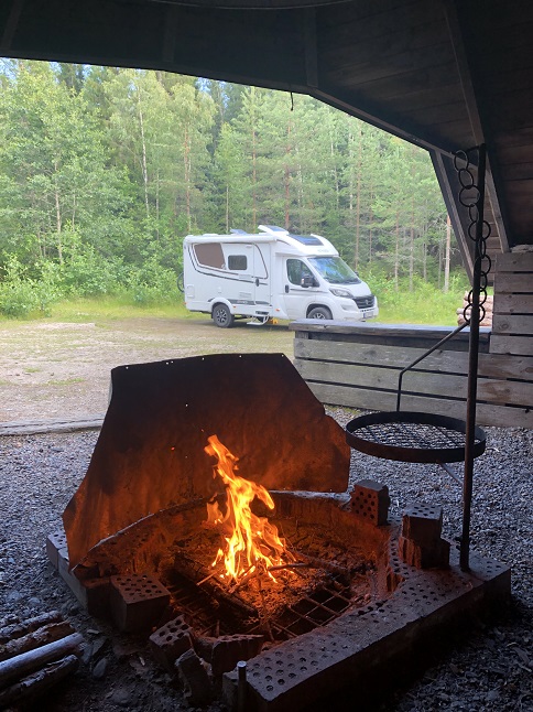 115) We had planned to camp at a beach parking lot in "new" Rauma but it was pretty busy so we turned south. We found an empty park area in a rural wooded area with a sauna for the locals. Since we were the only ones around we stoked up a fire and enjoyed what was basically an indoor campfire. We could hear an owl hooting in the evening and a local passing by told us that lynx frequent this area. Much better than a crowded beach parking lot in a city!