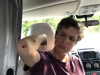 108) It was time for lunch so we started pedaling across town to find a recommended bistro. Unfortunately, as we crossed a road in a crosswalk the opposite curb wasn’t "ramped" but was a 5” high sharp edged stone curb. Jonna hit it wrong and she got dumped into that sharp curb on her right side. Her elbow split open and she got some big bruises on her arm, leg and hand. Curb 1, Jonna 0. Thankfully, she was spared any broken bones but it was close - rock and asphalt are unforgiving. We limped to the bistro only to find it closed. That meant a painful ride back across town and over the city’s famous river rapids (on a lovely, though unappreciated at the time, pedestrian bridge.) We found the city’s historic market hall and inside settled on an inexpensive Japanese Ramen stall. We cleaned up Jonna’s arm, relaxed at a table while eating good food and, with a full belly, got some ibuprofen into the patient.