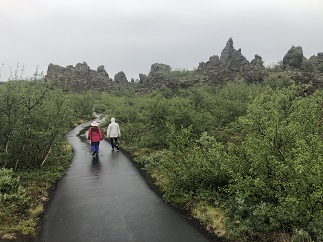 33) Dimmuborgir, Iceland, August 1, 2021 - We had a in-car picnic lunch in the car while watching raindrops patter on the surface of Lake Myvatn. Our last stop was at the Dimmuborgir (Black fortress) lava flow where 2,300 years ago lava covered a lake and the steam from the evaporating water blasted up through the lava to create wild shapes and countless caves. We checked into a big, modern hotel overlooking Lake Myvatn and found a nearby campground where we could do laundry.