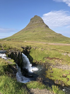 53) Kirkjufell, Iceland, August 7, 2021 - For our penultimate day driving Iceland’s ring road we left the Westfjords region behind and moved over to the Snæfellsnes peninsula. This move was done via an Icelandic ferry (no, not one of the mythical fairies but a big boat that carries cars and people!) We drove straight from our hotel to the ferry dock at Brjánslækur. We boarded the Baldur just after noon and had a cruise across Breiðafjörður bay with a quick stop at the tiny island of Flatey to drop-off/pick-up walk-on passengers. (If we return to Iceland an over night visit to Flatey will likely be on the itinerary.) 2 1/2 hours later we disembarked in Stykkishólmur and immediately headed west along the Snæfellsnes peninsula. Our first sightseeing stop of the day was just a short drive later at Kirkjufell mountain and waterfall. It is one of the most photographed mountains in Iceland so we followed the trend and took our own snaps. Once again we had perfect, cloudless blue skies so the scene was ideal and even our phone camera photos looked good.