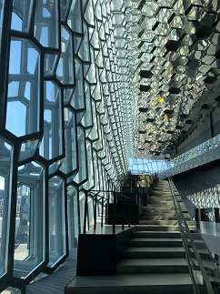 61) Harpa Concert Hall, Reykjavik, Iceland, August 10, 2021 - After a break at the hotel to rest Jonna and Alan hit the streets again to find lunch and then to see more of Reykjavik. Our first stop in the afternoon was the Harpa Concert Hall which is a striking and relatively new addition to the city’s architecture. We walked around inside to see through the geometric "fish scale" glass sides and to watch the reflections on the mirrored ceiling.